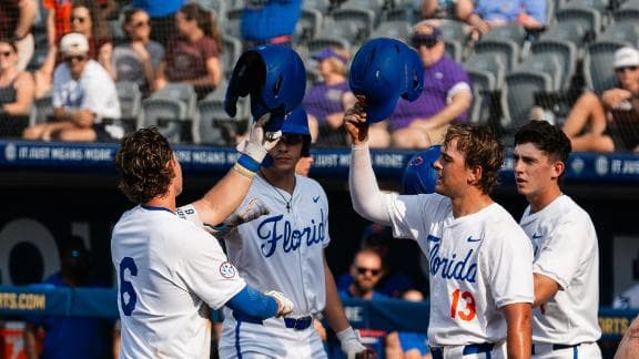 The Gators get multi-hit games from five different players and pound out 13 hits overall in an 11-3 win over the Gamecocks in the SEC Baseball Tournament.