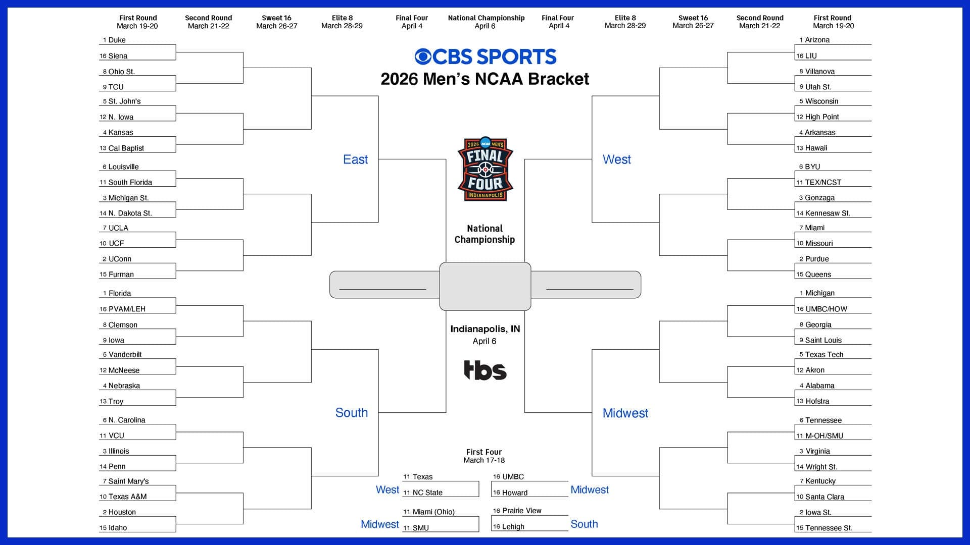 Get ready for the 2026 NCAA Tournament with a blank printable men's March Madness bracket to fill in now that the 68-team field has been unveiled